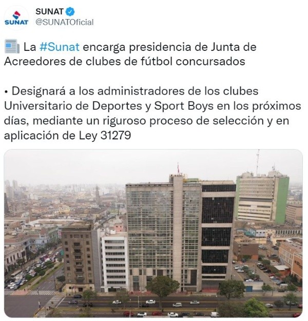 “La SUNAT designó hoy la presidencia provisional de la Junta de Acreedores de los clubes de fútbol profesional Universitario de Deportes y Sport Boys a los que aplica la Ley N° 31279, que regula el procedimiento concursal de apoyo a la actividad deportiva futbolística”, agregó la SUNAT en un comunicado emitido.