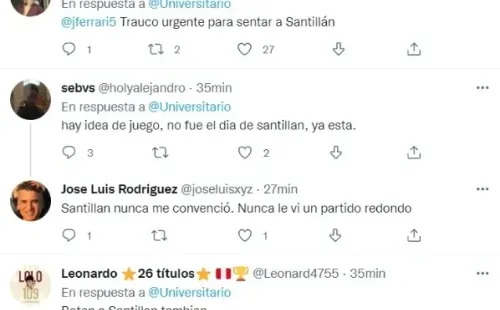 Sport Huancayo hizo efectiva su victoria con dos goles de penal, los mismos que ocasionó Iván Santillán, lateral izquierdo de Universitario de Deportes. Esto habría generado el malestar de los hinchas ‘Merengues’ que mediante las redes sociales del club irían contra el futbolista de los cremas, indicando que no deberían ponerlo más.