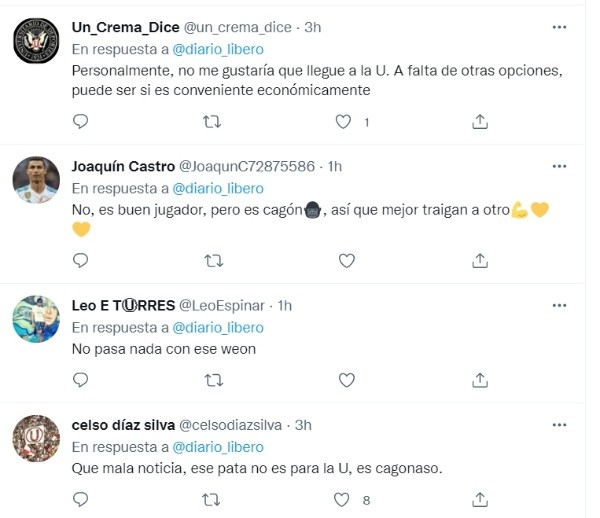 Por el momento no hay nada asegurado, pero los hinchas ‘merengues’ se niegan a que Joao Villamarín llegue a Ate, ya que dicen el jugador es hincha de Alianza Lima. Los usuarios en Twitter pusieron lo siguiente: “Ojalá que no”, “No tiene el perfil U”, “Quémala noticia, ese pata no es para la U, es cagonaso”, agregaron los internautas con insultos hacia el futbolista.