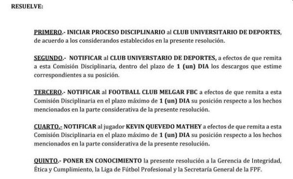 Brindando más información, la Comisión Disciplinaria de la FPF también expresó que cada una de las partes tendrá que presentar sus descargos en el plazo de un día. De esta forma, tanto el club Universitario de Deportes como FBC Melgar y el futbolista Kevin Quevedo tendrán que presentarse.