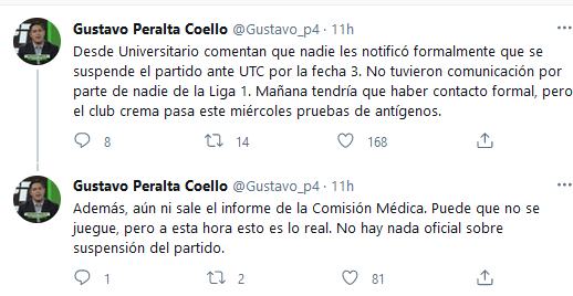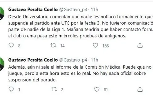Por el lado de Gustavo Peralta de Líbero, la información fue siguiente: “Desde Universitario comentan que nadie les notificó formalmente que se suspende el partido ante UTC por la fecha 3. No tuvieron comunicación por parte de nadie de la Liga 1. Mañana tendría que haber contacto formal, pero el club crema pasa este miércoles pruebas de antígenos”.