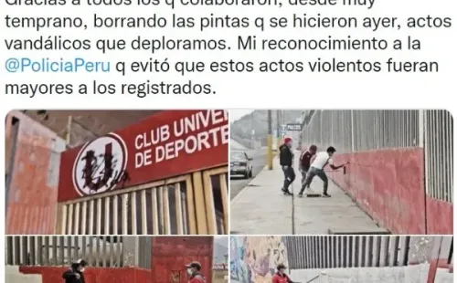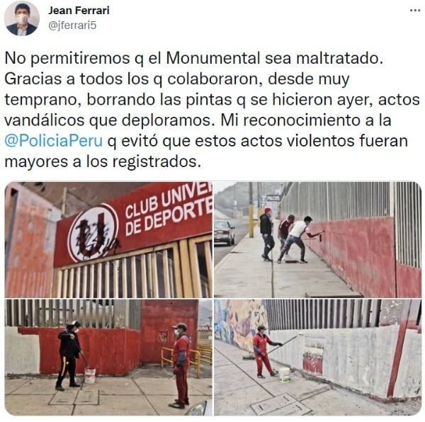 Jean Ferrari, administrador de Universitario de Deportes, lamentó lo sucedido en su cuenta de Twitter donde también agregó fotos de hinchas cremas tratando de borrar las pintas que habían realizado los supuestos ‘barristas’ del conjunto de La Victoria. “No permitiremos que el Monumental sea maltratado. Gracias a todos los que colaboraron desde muy temprano, borrando las pintas que se hicieron ayer, actos vandálicos que deploramos. Mi reconocimiento a la Policía Nacional del Perú que evitó que estos actos violentos fueran mayores a los registrados”.