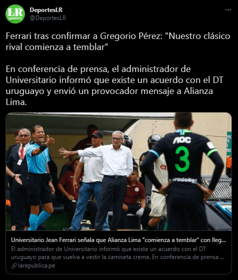 El clásico del fútbol peruano ya se está jugando sin partido confirmado. Universitario de Deportes con la llegada de Gregorio Pérez está ganando aparte de un buen profesional, un respaldo de experiencia y trabajo señala a su estilo Jean Ferrari. El actual administrador temporal ‘merengue’ afirmó que hay un equipo ya está temblando.