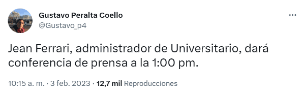 “Jean Ferrari, administrador de Universitario, dará conferencia de prensa a la 1:00 pm”, publicó el comunicador a través de su cuenta oficial de twitter.