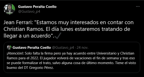 Así lo adelantaba el periodista del Diario Líbero, Gustavo Peralta: “Solo falta la firma, pero ya hay acuerdo entre Universitario y Christian Ramos para el 2022. El jugador volverá de vacaciones el fin de semana y tras eso se puede formalizar el trato, salvo alguna cosa de último momento. Tiene el visto bueno del DT Gregorio Pérez”. Es cuestión de tiempo nada más.