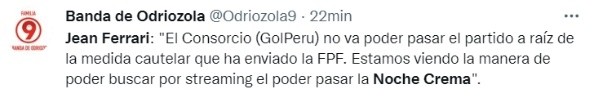 “La gente del Consorcio se comunicó con nosotros, diciendo que no van a poder pasar el partido a raíz de esta medida cautelar que ha enviado la FPF. Estamos viendo la manera de poder buscar por streaming el poder pasar la Noche Crema”, comunicó Jean Ferrari a Radio Ovación.
