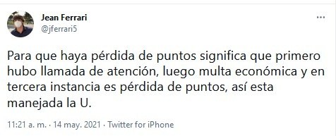 “Para que haya pérdida de puntos significa que primero hubo llamada de atención, luego multa económica y en tercera instancia es pérdida de puntos, así esta manejada la U”, escribió el también exfutbolista.