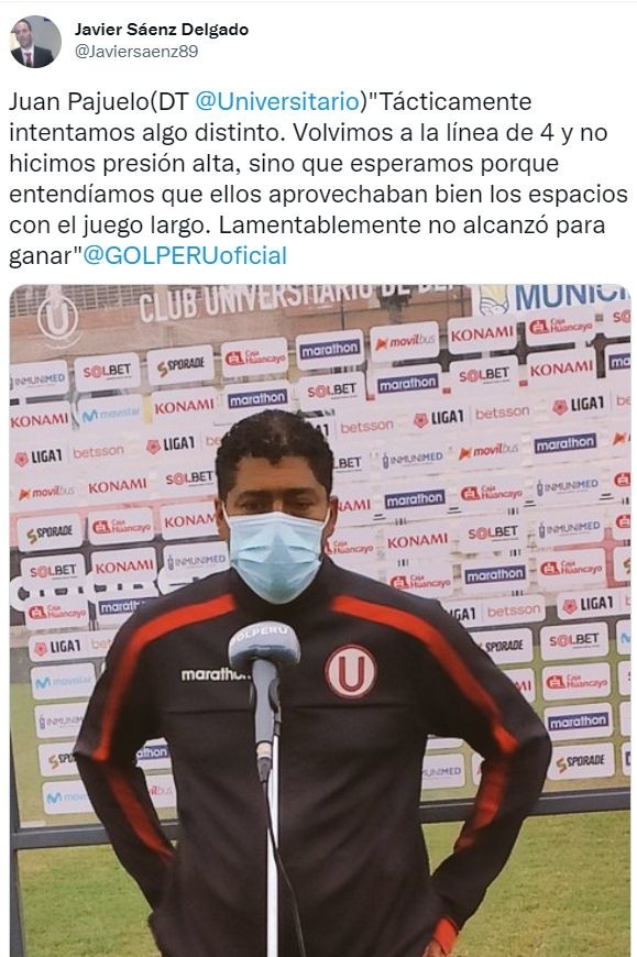 Tras la salida de Ángel Comizzo, al finalizar el partido Juan Pajuelo declaró lo siguiente: “Agradezco a Dios y al club por esta oportunidad para dirigir temporalmente. También a los profesores Comizzo, Pumpido, Ripacolli y Melgarejo por el gran trabajo que realizaron acá. Quería dedicarles un triunfo. Lástima que no se dio“, declaró el DT ‘merengue’, lo que hizo público en su Twitter Javier Sáenz, periodista de Gol Perú.