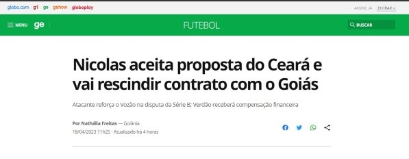 “Nicolás acepta propuesta de Ceará y rescindirá contrato con Goiás”, es el titular que propone GloboEsporte en su página web como prioridad. A falta de muy poco de lo que será el partido entre el conjunto verde y Universitario de Deportes por la Copa Sudamericana 2023. Efectivamente, chocarán en el Estadio Monumental este jueves 20 de abril a las (9:00 PM – HORA PERUANA).