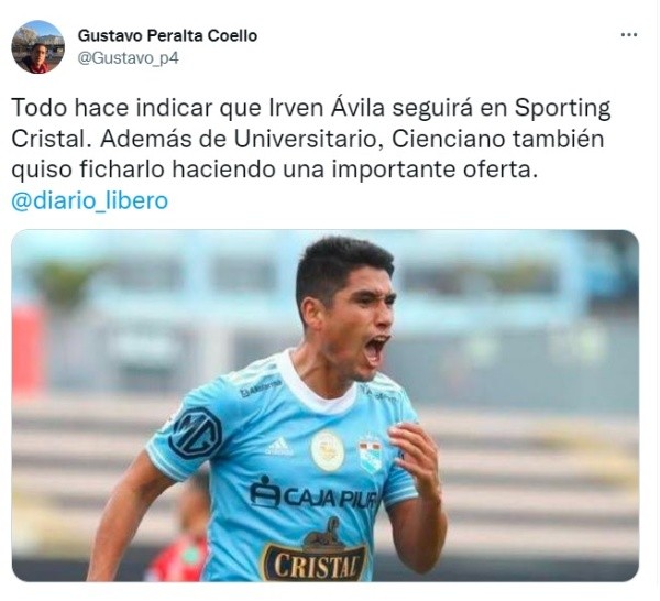 Hace poco se supo que los cremastiene en sus planes a Irven Ávila y podría convertirlo en su nuevo delantero para afrontar Copa Sudamericana y Liga 1 el siguiente año, pero ahora también a ese interés se le sumó Cienciano del Cusco. Pese a ello, y a las ofertas que recibió el delantero peruano, todo apunta a que continuará en Sporting Cristal, club del que es el quinto máximo goleador histórico con 117 anotaciones.
