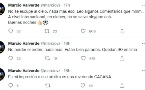 Se habló mucho, por parte de los ‘cremas’, de lograr un empate, algo que no se pudo al final. En ese sentido, el futbolista Marcio Valverde publicó en cuenta de Twitter un dardo tras concluir el encuentro entre los ‘merengues’ y los ecuatorianos: “No se escupe al cielo, nada más eso. Leo algunos comentarios que mmm… A nivel internacional en clubes, no se salva ninguno acá. Buenas noches”, sostuvo el jugador de Alianza Atlético de Sullana.