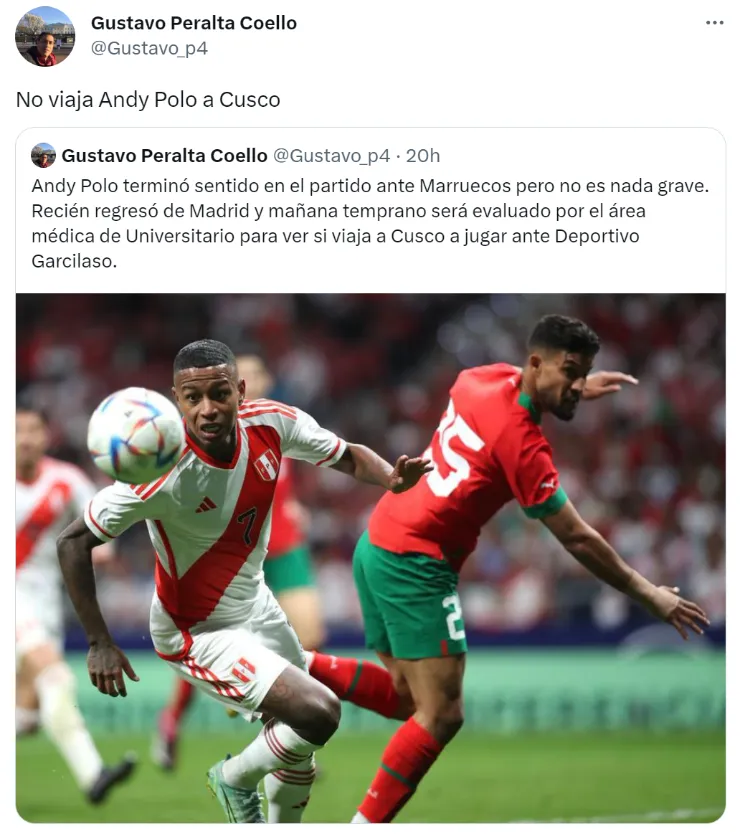 Andy Polo es la gran baja del equipo merengue para este cotejo. El extremo llegó de la gira europea con la Selección Peruana; no obstante, vino lastimado por lo que el estratega uruguayo no lo consideró para este encuentro. Esta información la dio a conocer el periodista Gustavo Peralta.