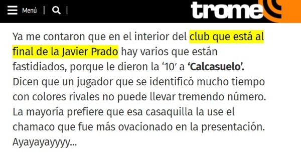 “Ya me contaron que en el interior del club que está al final de la Javier Prado hay varios que están fastidiados, porque le dieron la ‘10′ a ‘Calcasuelo’. Dicen que un jugador que se identificó mucho tiempo con colores rivales no puede llevar tremendo número. La mayoría prefiere que esa casaquilla la use el chamaco que fue más ovacionado en la presentación. Ayayayayyyy”, publicó “El Bombardero” en su columna Pisa Pelota.