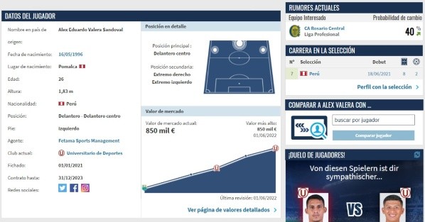 Tomando como referencia la página Transfermarkt, el medio digital, experto en tasar jugador de fútbol, ha establecido que el precio de Alex Valera es de 850 mil dólares. Ese sería el costo del pase aproximado, si es que Rosario Central desea tenerlo.