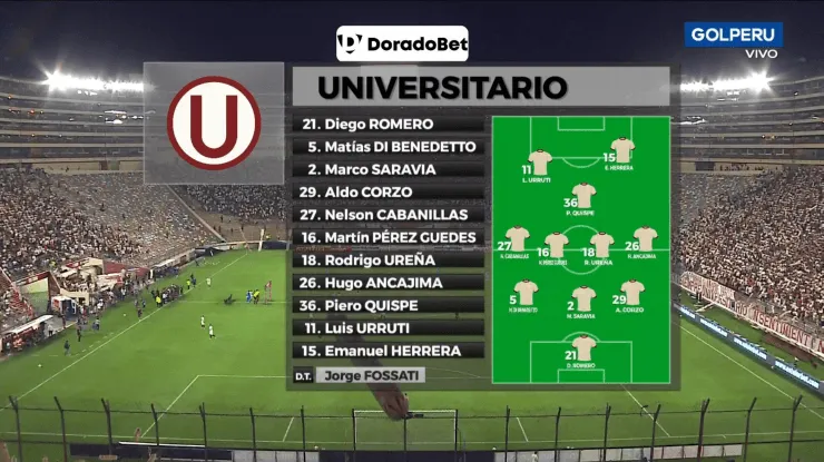 Así que el uruguayo no hará ninguna modificación al último once que presentó ante el Vendaval Celeste y mandará a los mismos, conformados por: Diego Romero; Hugo Ancajima, Aldo Corzo, Marco Saravia, Matías Di Benedetto, Nelson Cabanillas; Rodrigo Ureña, Martín Pérez Guedes, Piero Quispe; Luis Urruti y Emanuel Herrera.