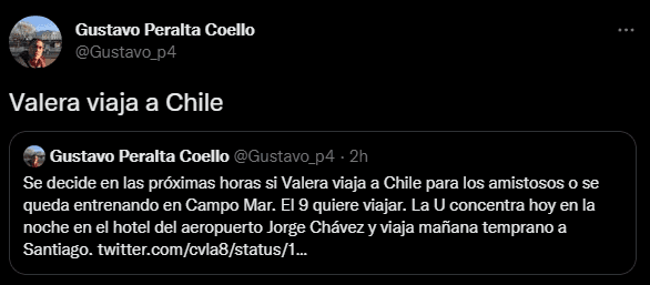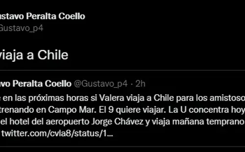 Fiel a su estilo de trabajo, el periodista deportivo del Diario Líbero y PBO Campeonísimo, Gustavo Peralta, contó las últimas novedades sobre este caso: “Se decide en las próximas horas si Valera viaja a Chile para los amistosos o se queda entrenando en Campo Mar. El 9 quiere viajar. La U concentra hoy en la noche en el hotel del aeropuerto Jorge Chávez y viaja mañana temprano a Santiago”.