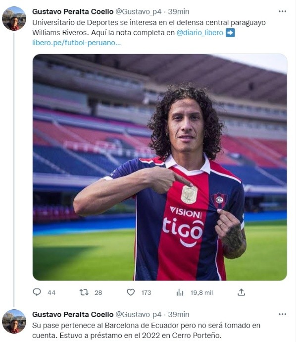“Universitario de Deportes se interesa en el defensa central paraguayo Williams Riveros. Su pase pertenece a Barcelona de Ecuador, pero no será tomado en cuenta. Estuvo en préstamo en el 2022 en Cerro Porteño”, comentó el hombre de prensa.
