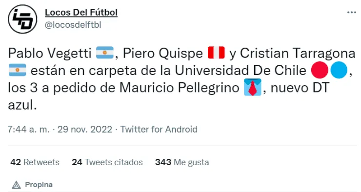 Por eso que, con la llegada de Mauricio Pellegrino como entrenador de La Bulla, la Directiva del club, quierecambiar todos esos acontecimientos que no han sido nada positivo y desean reforzarse con lo mejor que hay en otras ligas. Los que se encuentran en carpeta son: Pablo Vegetti, Piero Quispe y Cristian Tarragona, así informó el medio deportivo chileno, Locos del fútbol.