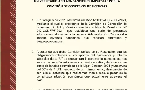 “A pesar de que dicha Comisión señaló en su Resolución que las obligaciones relativas a los aportes del empleador y tributos laborales de la ‘U’ se encuentran cancelados, nos impuso la sanción más severa a nivel deportivo”, agregaron desde Ate indicando que no tienen ninguna deuda pendiente o algo parecido.