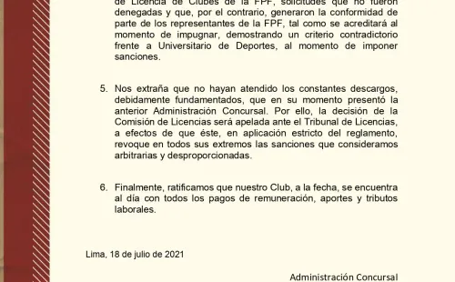 Desde tienda ‘crema’ aseguran que la antigua administración del club realizó descargos sobre este tema, pero nunca les hicieron caso. “Nos extraña que no hayan atendido los constantes descargos, debidamente fundamentados, que en su momento presentó la anterior Administración Concursal… no existen pagos pendientes o remuneraciones acumuladas”.