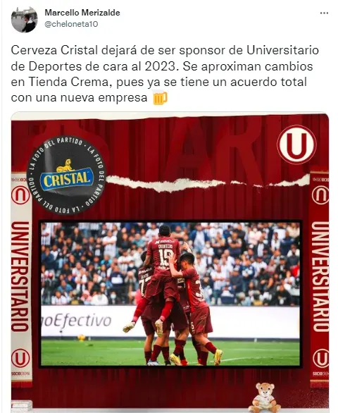 “Cerveza Cristal dejará de ser sponsor de Universitario de Deportes de cara al 2023. Se aproximan cambios en Tienda Crema, pues ya se tiene un acuerdo total con una nueva empresa”, publicó Merizalde en sus redes sociales.