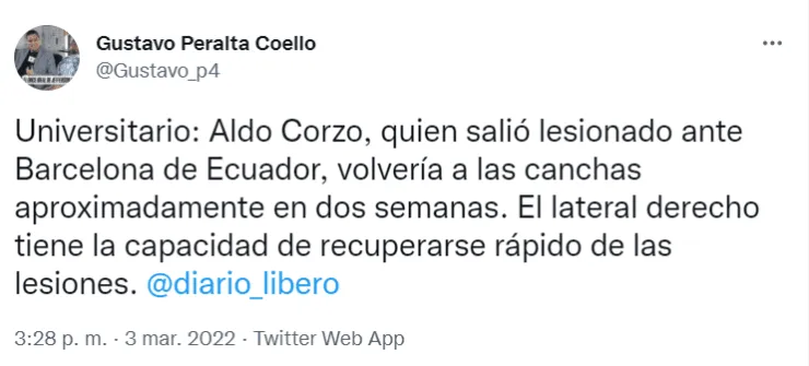 “Aldo Corzo, quien salió lesionado ante Barcelona de Ecuador, volvería a las canchas aproximadamente en dos semanas. El lateral derecho tiene la capacidad de recuperarse rápido de las lesiones”, reveló el conocido periodista Gustavo Peralta.