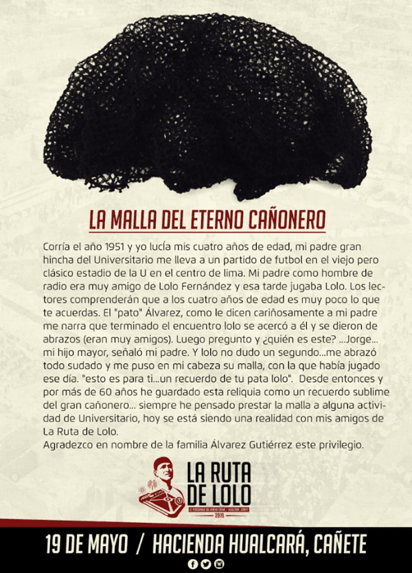 El informe le dio una mención especial al máximo ídolo y anotador de Universitario de Deportes: “Hoy es muy habitual ver jugadores sin nada en la cabeza, pero antes era todo lo contrario y la prueba de ello es el peruano Lolo Fernández, quien jugaba con una malla en la cabeza y lo usaba como forma de homenaje a su madre”.