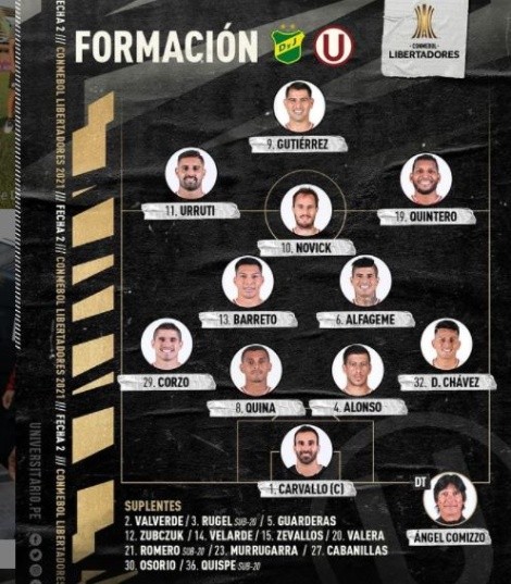 Una de las novedades en el equipo crema con respecto al partido del pasado domingo ante Sporting Cristal es el ingreso de Diego Chávez por derecha, lo que lleva a que Aldo Corzo alinea como lateral izquierdo.