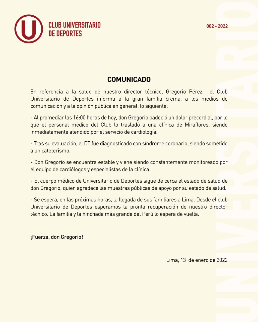 La familia de Gregorio Pérez llegó a Lima para apoyarlo en este difícil momento: “Este viernes llegan la señora y los dos hijos de Gregorio, y a ellos se les dará el parte médico al mediodía Por ahora, está todo bien y, si Dios quiere, saldrá todo bien. El club se ha portado 10 puntos, la gente, la prensa, lo que genera él es impresionante, habiendo tenido tan poco tiempo de trabajo en Perú. El cariño, incluso personas en el sanatorio, se hizo presente”, finalizó Edgardo Adolfini.