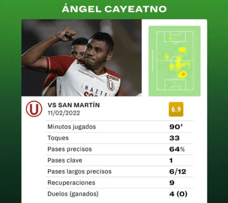 Según los datos de SofaScore, Cayetano ganó los cuatro duelos que tuvo ante San Martín,tuvo nueve recuperaciones y también unimportante rendimiento con el balón en los pies.Además, el uruguayo logró completar 33 toques con el balón, consiguiendo un64% de efectividad en los pases ejecutados, siendo seis de ellos de larga distancia.