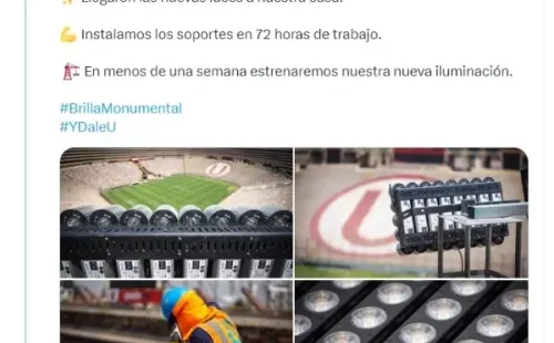 “Llegaron las nuevas luces a nuestra casa. Instalamos los soportes en 72 horas de trabajo. En menos de una semana estrenaremos nuestra nueva iluminación”, fue la publicación que hizo la gente de Universitario de Deportes en referencia a su nuevo sistema de iluminación.