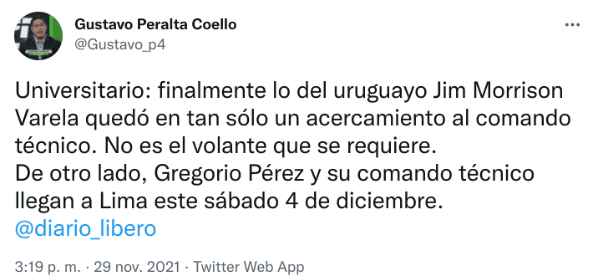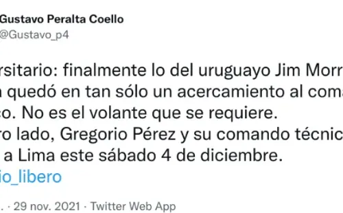 Gustavo Peralta habló de uno en particular: “Finalmente lo del uruguayo Jim Morrison Varela quedó en tan sólo un acercamiento al comando técnico. No es el volante que se requiere. De otro lado, Gregorio Pérez y su comando técnico llegan a Lima este sábado 4 de diciembre”. Ahora, habrá que seguir buscando.
