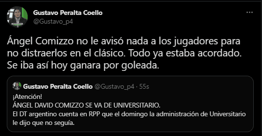 Una explicación más detallada la brinda Gustavo Peralta, del ‘Diario Líbero’ quien señala lo siguiente: “Ángel Comizzo no le avisó nada a los jugadores para no distraerlos en el clásico. Todo ya estaba acordado. Se iba así hoy ganara por goleada.Ojo que no es renuncia. Ya le habían avisado el domingo”. Concluyó el comunicador.