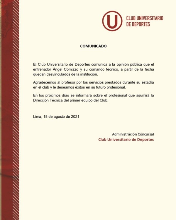 Con la salida de la actual administración en Universitario de Deportes, la continuidad de Ángel David Comizzo pendía de un hilo. Era prácticamente imposible que el director técnico permanezca dentro de la institución.