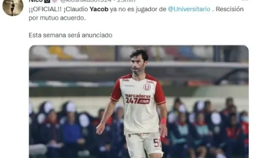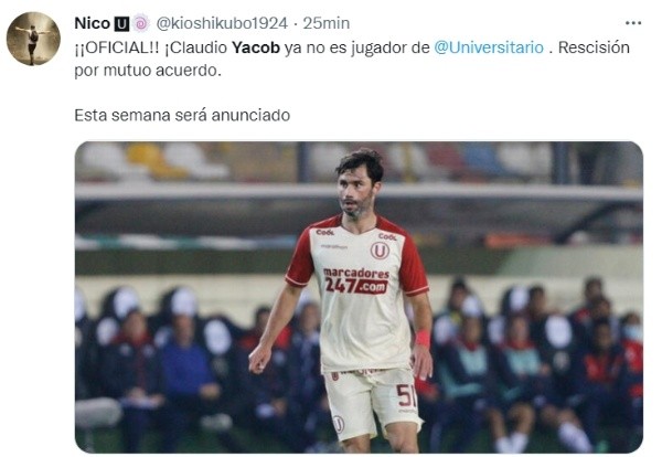 En ese sentido, el usuario de Twitter Nico U, con nombre @kioshikubo1924, publicó en sus redes sociales que Claudio Yacobno va más en Universitario de Deportes. Según su texto, el club y el volante llegaron a un acuerdo y el contrato se rescindió.