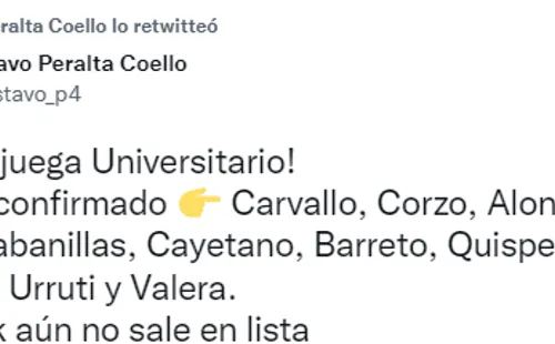 “Mañana juega Universitario. Once confirmado:Carvallo, Corzo, Alonso, Quina, Cabanillas, Cayetano, Barreto, Quispe, Quintero, Urruti y Valera.Novick aún no sale en lista”, reveló el periodista Gustavo Peralta, quien maneja información del equipo merengue.