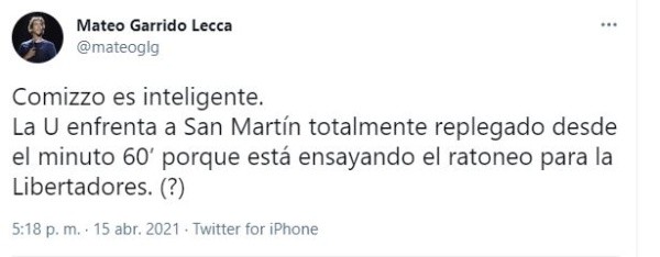“Ángel Comizzo es inteligente. La U enfrenta a San Martín totalmente replegado desde el minuto 60’ porque está ensayando el ratoneo para la Libertadores. (?)”.
