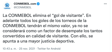 “La CONMEBOL elimina el “gol de visitante”. En adelante todos los goles de los torneos de la CONMEBOL tendrán el mismo valor, ya no se considerará como un factor de desempate los tantos convertidos en calidad de visitante. Con ello, se apunta a una mayor justicia deportiva”, señalaron en las redes sociales oficialmente ¡A estar atentos!