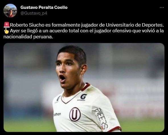 Lo que mencionó el panelista de PBO Campeonísimo, es la confirmación de algo que se venía hablando con certezas en las últimas semanas: “Roberto Siucho es formalmente jugador de Universitario de Deportes. Ayer se llegó a un acuerdo total con el jugador ofensivo que volvió a la nacionalidad peruana”.
