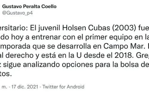 Este viernes, Gustavo Peralta informó al respecto lo siguiente: “El juvenil Holsen Cubas (2003) fue llamado hoy a entrenar con el primer equipo en la pretemporada que se desarrolla en Campo Mar. Es lateral derecho y está en la U desde el 2018. Gregorio Pérez sigue analizando opciones para la bolsa de minutos”. Ya se verá cómo le va.