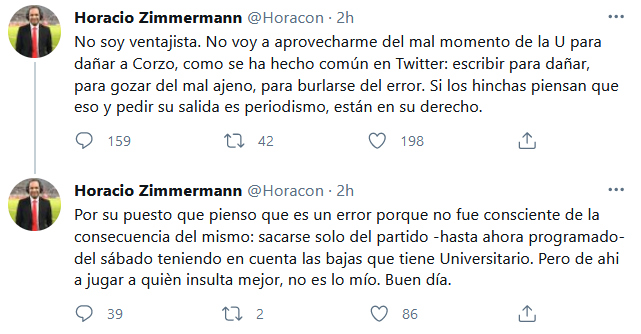 “No soy ventajista. No voy a aprovecharme del mal momento de la U para dañar a Corzo, como se ha hecho común en Twitter: escribir para dañar, para gozar del mal ajeno, para burlarse del error. Si los hinchas piensan que eso y pedir su salida es periodismo, están en su derecho”, escribió para comenzar.