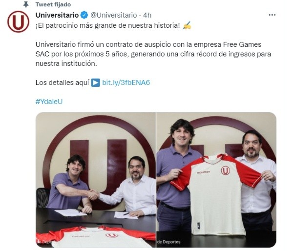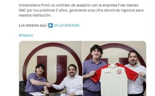 En Universitario de Deportes la administración ‘crema’ viene haciendo una gran labor. Esta vez fue Jean Ferrari y su grupo de trabajo, los que cerraron con un auspiciador un monto millonario de 10 millones de dólares. La empresa que se uniría a la familia ‘merengue’ sería ‘Free Games’ SAC quienes han apostado por los de ATE con un contrato por 5 años.