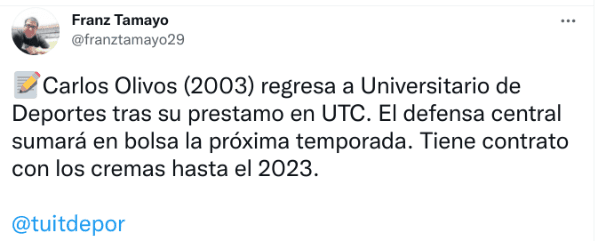 Franz Tamayo de Depor dio una información en este sentido: “Carlos Olivos (2003) regresa a Universitario de Deportes tras su prestamo en UTC. El defensa central sumará en bolsa la próxima temporada. Tiene contrato con los cremas hasta el 2023”.