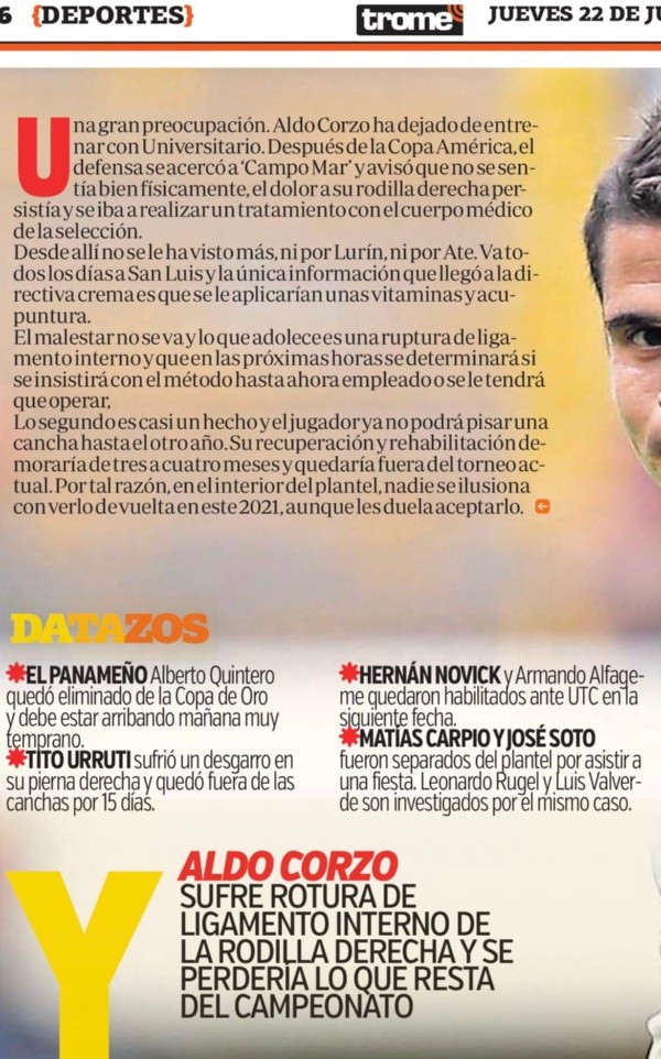 Erick Osores complementó: “Aldo Corzo seguirá siendo baja en Universitario de Deportes por un tiempo prolongado. La dolencia de Corzo está situada en el cartílago de la rodilla derecha”. Ahora, el DT deberá buscar un remplazo a su altura ¡Difícil!