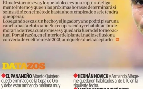El detalle de su situación según Andrea Closa es el siguiente: “Tiene lesión en el cartílago de la rodilla derecha, fuentes cercanas al jugador nos comentan que no sería necesario que se opere. Pero por el momento es baja indefinida”.