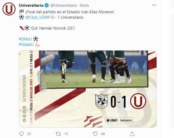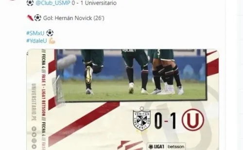 Luego de dos fechas con un empate ante Melgar y derrota ante Cantolao, Universitario obtuvo su primer triunfo en la Liga 1, luego de vencer por 1-0 a la San Martín con tanto del uruguayo Hernán Novick.