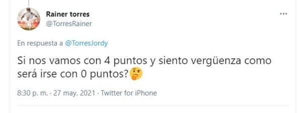 “Si con 4 puntos siento vergüenza, ¿cómo será irme con 0 puntos?”, escribió el exvolante de Universitario que siempre esta activo en redes sociales mostrando su cariño y además siempre sale en defensa de la U.