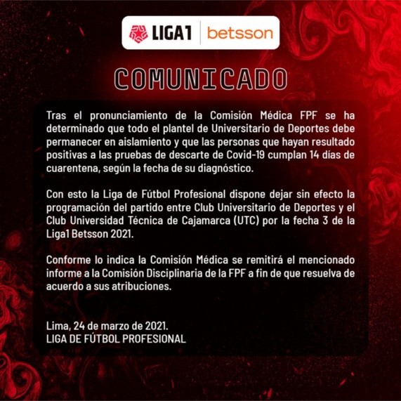 Un día antes de conocerse la suspensión, el club crema mediante una carta ya había solicitado a los representantes de la Liga 1 que el partido se suspenda, sin embargo, en UTC no tomaron la noticia de buena forma ya que aseguran que no se trata igual a todos los equipos.