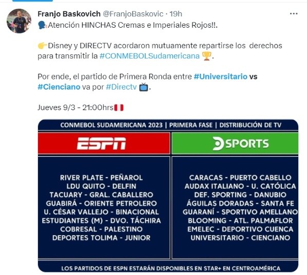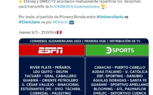 Confirmándose este 1 de marzo qué señal televisiva transmitirá el partido entre Universitario de Deportes ante Cienciano del Cusco, al final Disney y DirecTV Sports se habrían puesto de acuerdo y llegaron a la conclusión que el partido será emitido por DSports.