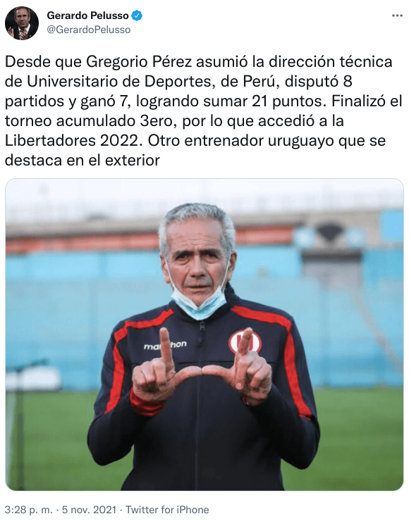 Gerardo Pelusso, este viernes, le dedicó un tweet: “Desde que Gregorio Pérez asumió la dirección técnica de Universitario de Deportes, de Perú, disputó 8 partidos y ganó 7, logrando sumar 21 puntos. Finalizó el torneo acumulado 3ero, por lo que accedió a la Libertadores 2022. Otro entrenador uruguayo que se destaca en el exterior”. ¡Tremendo!